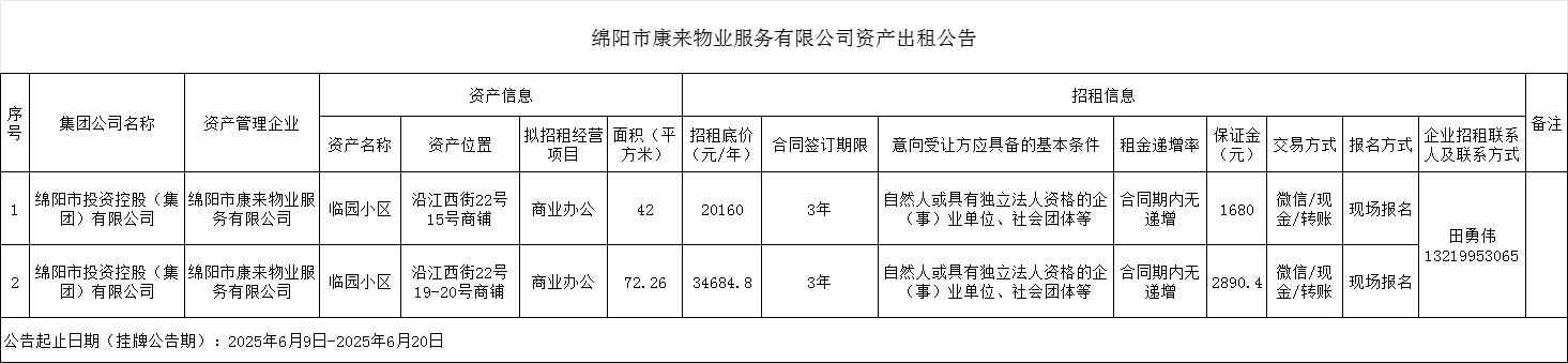 綿陽市康來物業(yè)服務(wù)有限公司資產(chǎn)出租公告