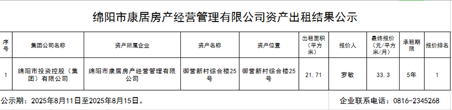 綿陽市康居房產經營管理有限公司資產出租結果公示