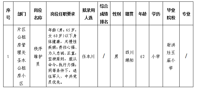 根據(jù)康居公司發(fā)布的長期招聘一線勤雜人員的招聘公告相關(guān)規(guī)定,經(jīng)面試、體檢等程序,擬錄用任本川同志到綿陽市康居房產(chǎn)經(jīng)營管理有限公司片區(qū)公租房管理處圣水公租房小區(qū)工作,現(xiàn)予以公示,具體情況如下: