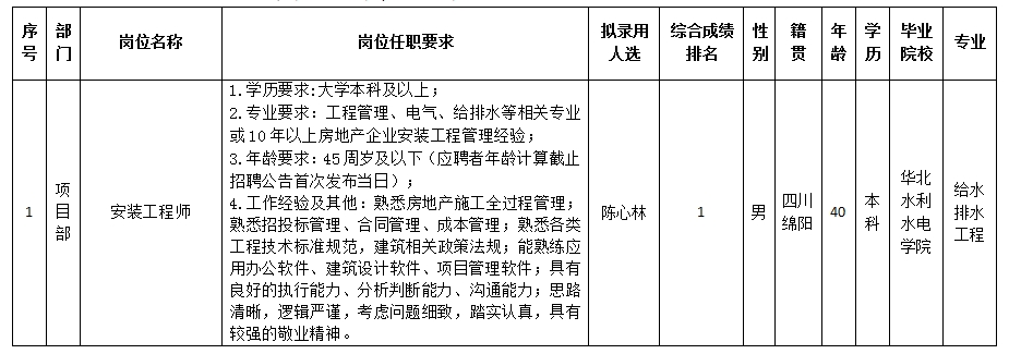 根據(jù)綿陽(yáng)市綿投置地有限公司發(fā)布的招聘公告及招聘相關(guān)規(guī)定,經(jīng)筆試、面試、考察、體檢等程序,擬錄用陳心林同志到綿陽(yáng)市綿投置地有限公司工作,現(xiàn)予以公示,具體情況如下: