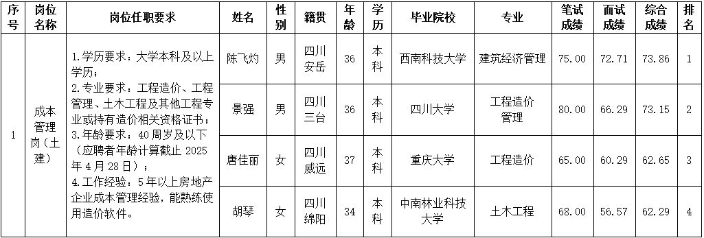根據(jù)綿陽市綿投置地有限公司發(fā)布的招聘公告及招聘相關(guān)規(guī)定,經(jīng)筆試、面試等程序,現(xiàn)將筆試面試成績予以公示。
