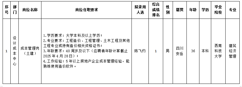 【公開招聘】綿陽市綿投置地有限公司關(guān)于招聘成本管理崗(土建)擬錄用人員的公示