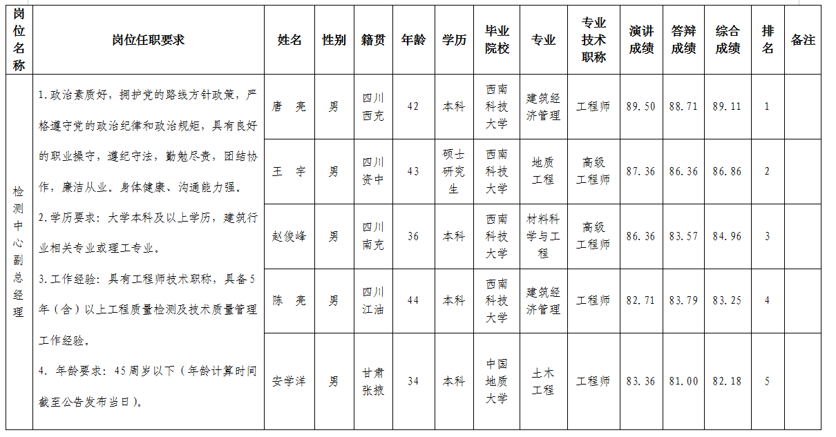 【市場化選聘】綿陽富達資產(chǎn)經(jīng)營有限責(zé)任公司關(guān)于市場化招聘下屬綿陽市建設(shè)工程質(zhì)量檢測中心有限責(zé)任公司副總經(jīng)理的成績公示