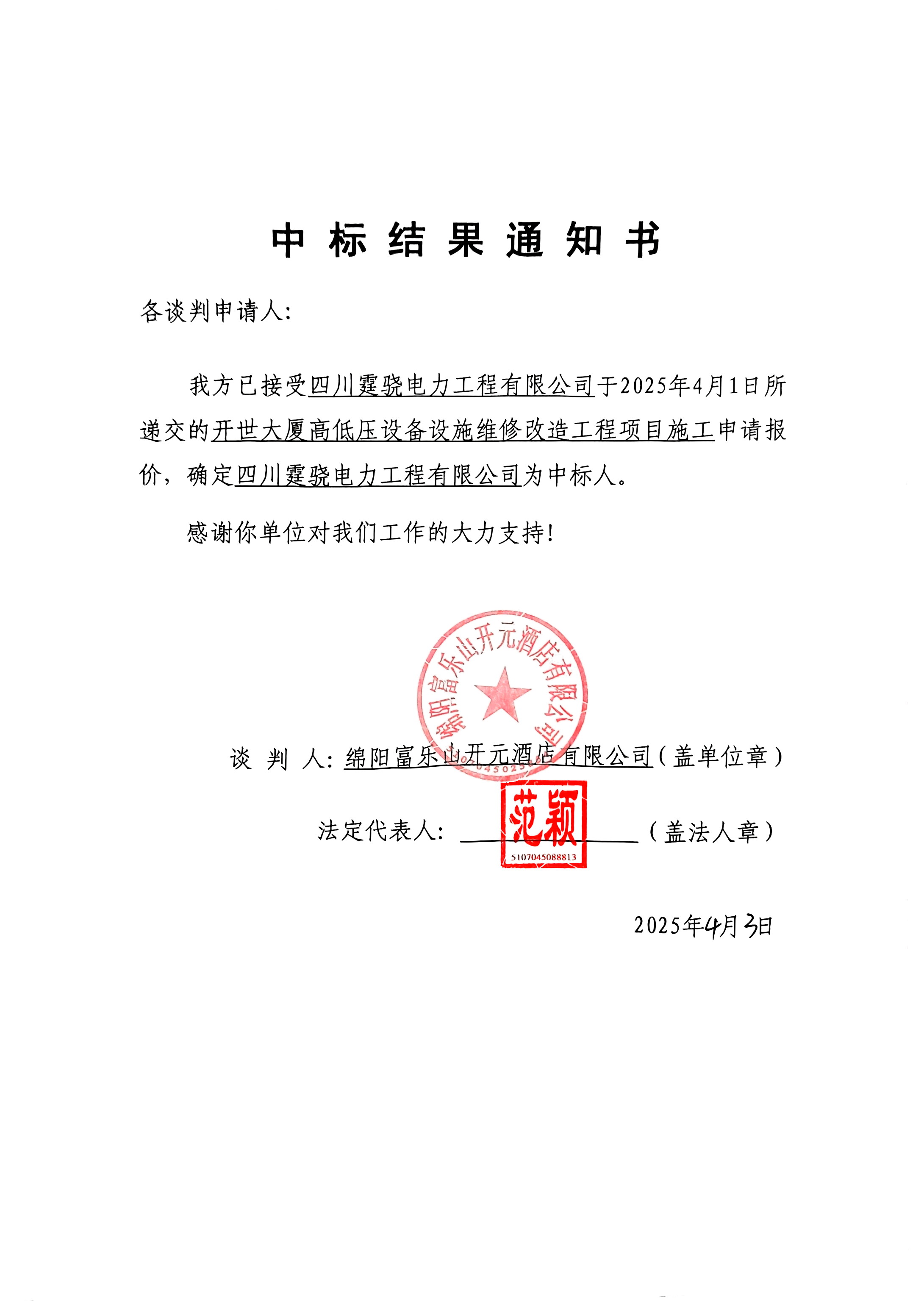 開(kāi)世大廈高低壓設(shè)備設(shè)施維修改造工程項(xiàng)目施工競(jìng)爭(zhēng)性談判結(jié)果公告