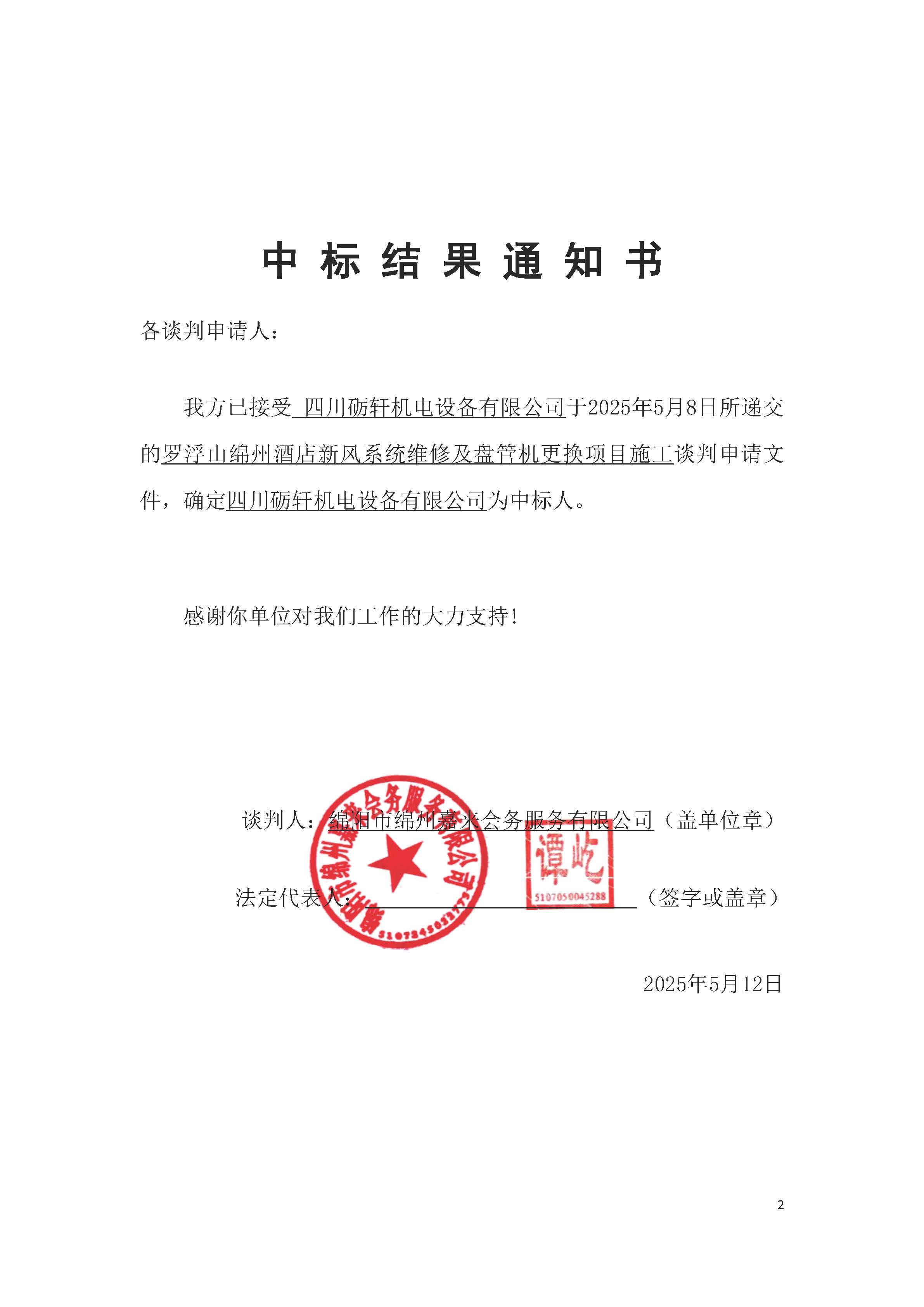 羅浮山綿州酒店新風(fēng)系統(tǒng)維修及盤管機更換項目施工中標結(jié)果通知