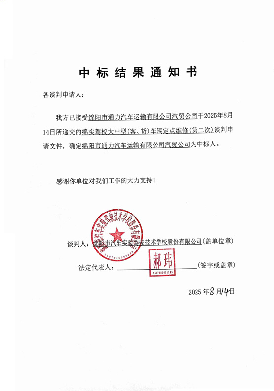 綿實(shí)駕校大中型(客、貨)車(chē)輛定點(diǎn)維修(第二次)中標(biāo)結(jié)果通知