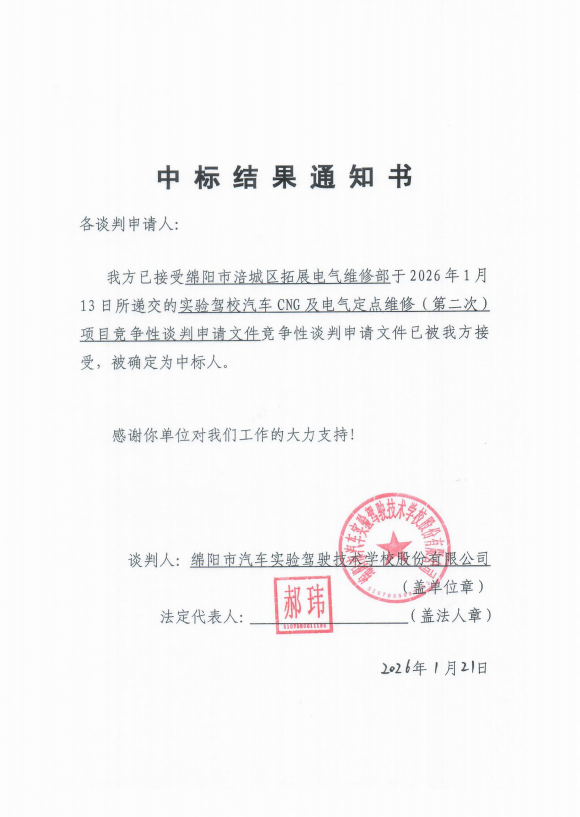 實(shí)驗(yàn)駕校汽車CNG及電氣定點(diǎn)維修項(xiàng)目中標(biāo)結(jié)果通知